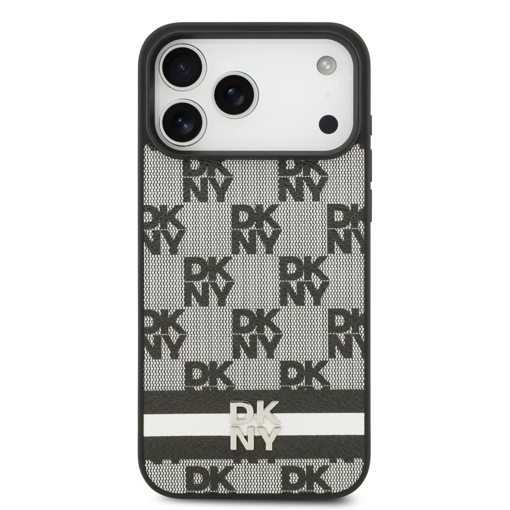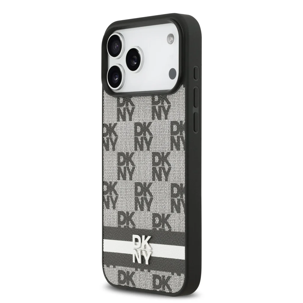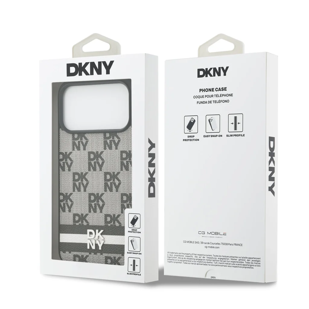 A DKNY PU bőr kockás minta és csíkos prémium hátlap elegáns és jellegzetes mintázattal rendelkezik, melyet egy fémes DKNY logó egészít ki.