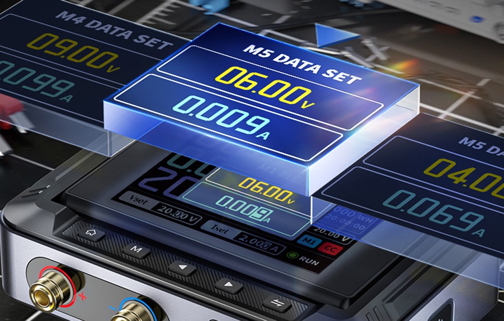 Kényelmes működés: A beépített 2,8 hüvelykes színes IPS képernyő nagy felbontást és elforgathatóságot kínál. Valós időben mutatja a feszültség-, áram-, teljesítmény-, hőmérséklet- és energiaszámlálókat. A DPS150 akár 6 előre beállított feszültség- és árambeállítási profilt is elmenthet.