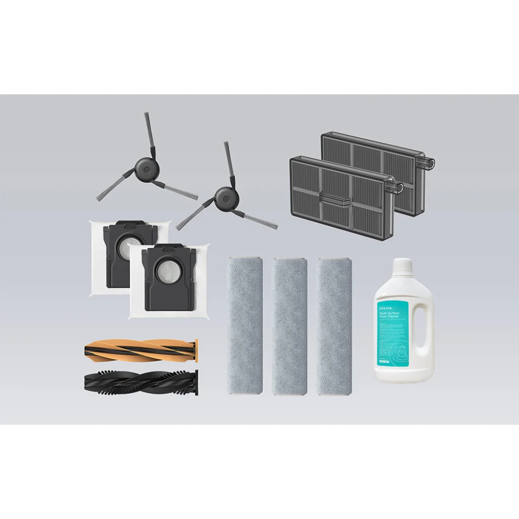Tartozékkészlet a Dreame Aqua10 Ultra Track Complete, Aqua10 Ultra Track, Aqua 10 Pro Track, Aqua10 Track, Aqua10 Track modellekhez. A Dreame tisztítórobot tartozékkészlet egy komplett csomag fogyóeszközt tartalmaz, amelyekkel készülékét a legjobb tisztítási állapotban tarthatja. A készletben talál egy porzsákot és egy szűrőt a portartályhoz, amelyek gondoskodnak a készülék hatékony szűréséről és higiéniájáról. A készlet tartalmaz továbbá egy Detangling DuoBrush és két oldalsó kefét, amelyek ideálisak a por, a haj és a törmelék alapos felszedéséhez. Az egész készletet a felmosóbetétek és az AWH6 padlótisztító teszi teljessé, amelyek friss és fényes eredményt biztosítanak bármilyen felületen. Ez a tökéletes készlet a Dreame robot átfogó ápolásához.