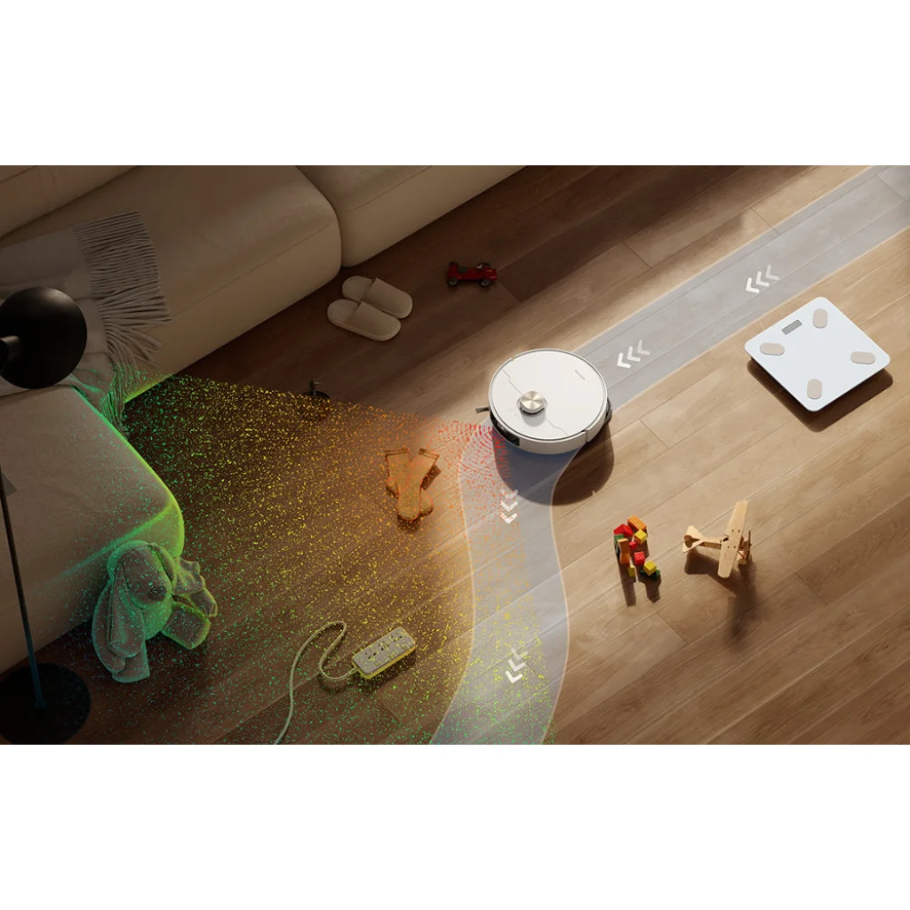 A Dreame L40s Pro Ultra intelligenciája a Pathfinder™ rendszeren alapul, amely precíz térképeket készít akár négy emeletről is. Beépített 3D strukturált fénye és AI algoritmusai több mint 180 féle tárgyat képesek felismerni, és ehhez igazítani az útvonalat. Legyen szó a padlón felejtett kávészemekről, játékokról, kábelekről vagy akár háziállatokról, a robot intelligensen elkerüli azokat (lásd a mellékelt képeket, ahol a robot okosan manőverez a tárgyak és a háziállatok körül). A beépített LED-világításnak köszönhetően sötétben is hatékonyan működik, megőrizve a pontosságot és a manőverezés hatékonyságát, így éjszaka vagy gyengén megvilágított helyiségekben is tökéletes tisztaságot biztosít (ahogy azt az egyik kép is szemlélteti).