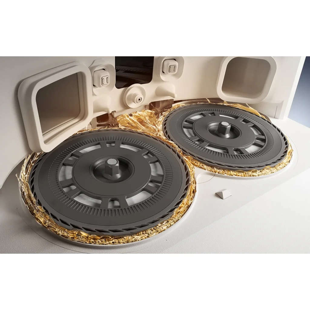 A Dreame L40s Pro Ultra felmosási képességei messze túlmutatnak a megszokotton. A PowerDock™ állomás automatikusan elvégzi a felmosóbetétek tisztítását és szárítását, így a robot mindig frissen és higiénikusan indul a következő feladatra. A felmosóbetéteket 75°C-os forró vízzel, akár 20 fúvókán keresztül öblíti, majd az AceClean™ DryBoard rendszer eltávolítja a szennyeződéseket és tisztítószer maradványokat. Ezt követően meleg levegővel szárítja őket, megakadályozva a penészedést és a kellemetlen szagokat. Az állomás automatikusan utántölti a robot víztartályát és a mosószer adagolót, így garantált a folyamatos, hatékony felmosás. A dokkoló elegáns arany elemei nem csak funkcionálisak, hanem esztétikai élményt is nyújtanak (ahogy a termékképeken is látható).