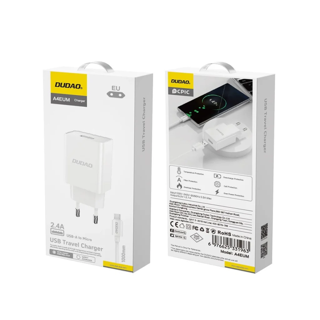 Dudao A4EU USB-A 2.1A fali töltő - fehér Az energiára egyre nagyobb igény van a digitális világunkban, így kulcsfontosságú egy hatékony és megbízható töltőforrás megtalálása. A Dudao A4EU USB-A 2.1A fali töltő, elegáns fehér burkolatával, optimális töltési sebességet kínál eszközeinek. Biztonságos használatra tervezve tűzálló anyagokból készül, kompakt méretének köszönhetően pedig otthoni és utazási célokra is ideális. A Dudao A4EU USB-A 2.1A fali töltő legfontosabb előnyei: - Optimizált töltés. A 2.1A hatékonyságának köszönhetően az eszköz gyorsan és hatékonyan tölti fel az akkumulátorokat, minimalizálva a várakozási időt. - Biztonság garantált. Tűzálló anyagokból készült, biztonságos használatot biztosít, csökkentve a túlmelegedés kockázatát. - Tökéletes utazáshoz. A töltő kis méretei megkönnyítik a tárolást és szállítást, kiváló választás gyakori utazók számára. Műszaki adatok: - Márka: Dudao - Modell: A4EU - Szín: Fehér - Maximális teljesítmény: 10W - Csatlakozó típusa: USB-A (5V / 2.1A) - Anyag: PC + ABS - A készlet tartalmaz: USB-A - micro USB kábelt. Hatékony töltés. A 2.1A áram gyors és hatékony töltést biztosít eszközeinek, kevesebb várakozási időt jelent, így több időt kap eszközei használatára, amikor valóban szüksége van rájuk. Biztonságos konstrukció. Tűzálló anyagokból, mint a PC és ABS, a töltő nagyobb biztonságot nyújt használat közben. Ez a fejlett védelem minimalizálja az eszközének túlmelegedési kockázatát töltés közben. Kompakt és mobil. A Dudao A4EU USB-A 2.1A töltő kis mérete lehetővé teszi, hogy bárhová könnyedén magával vigye. Könnyen elfér bármilyen táskában vagy hátizsákban, megbízható energiaforrást biztosítva utazás közben.