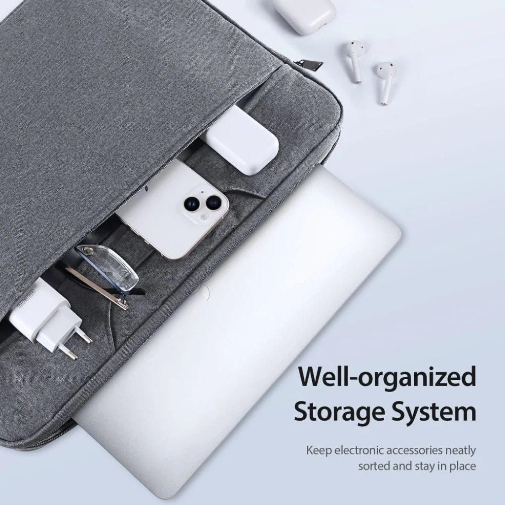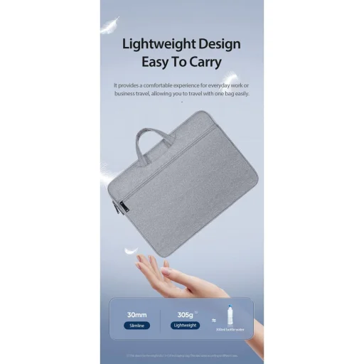 Dizájn és kényelem: A vékony és könnyű kialakítás révén a táska könnyen hordozható akár kézben, akár a hátizsákban az egyéb tárgyak közé fonva.