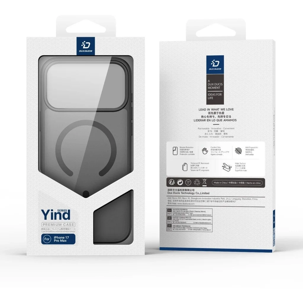 A Dux Ducis Yind elegáns és tartós tok, amelyet úgy terveztek, hogy megvédje és kényelmesen használhatóvá tegye az iPhone 17 Pro Max készülékét. A tok egy matt polikarbonát (PC) hátlapot kombinál puha TPU kerettel, amely biztos fogást és ellenállást nyújt karcolásokkal és ujjlenyomatokkal szemben. A beépített 38 mágnes teljes MagSafe kompatibilitást és stabil kiegészítőrögzítést biztosít. A négy sarokban található légpárnák hatékonyan nyelik el az ütéseket, és védelmet nyújtanak leejtés esetén. A tartósság, a kényelem és a biztonság klasszikus fekete dizájnba ötvöződik.