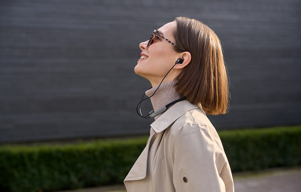A puha, rugalmas TPE fejpánt szorosan illeszkedik a nyakadhoz, és nem csíp - még több órás viselés után sem. Ugyanakkor a fejhallgató nagyon könnyű (31 g), és a mágneses végeknek köszönhetően könnyen felcsíptethető és elrejthető anélkül, hogy a kábel összegabalyodna.