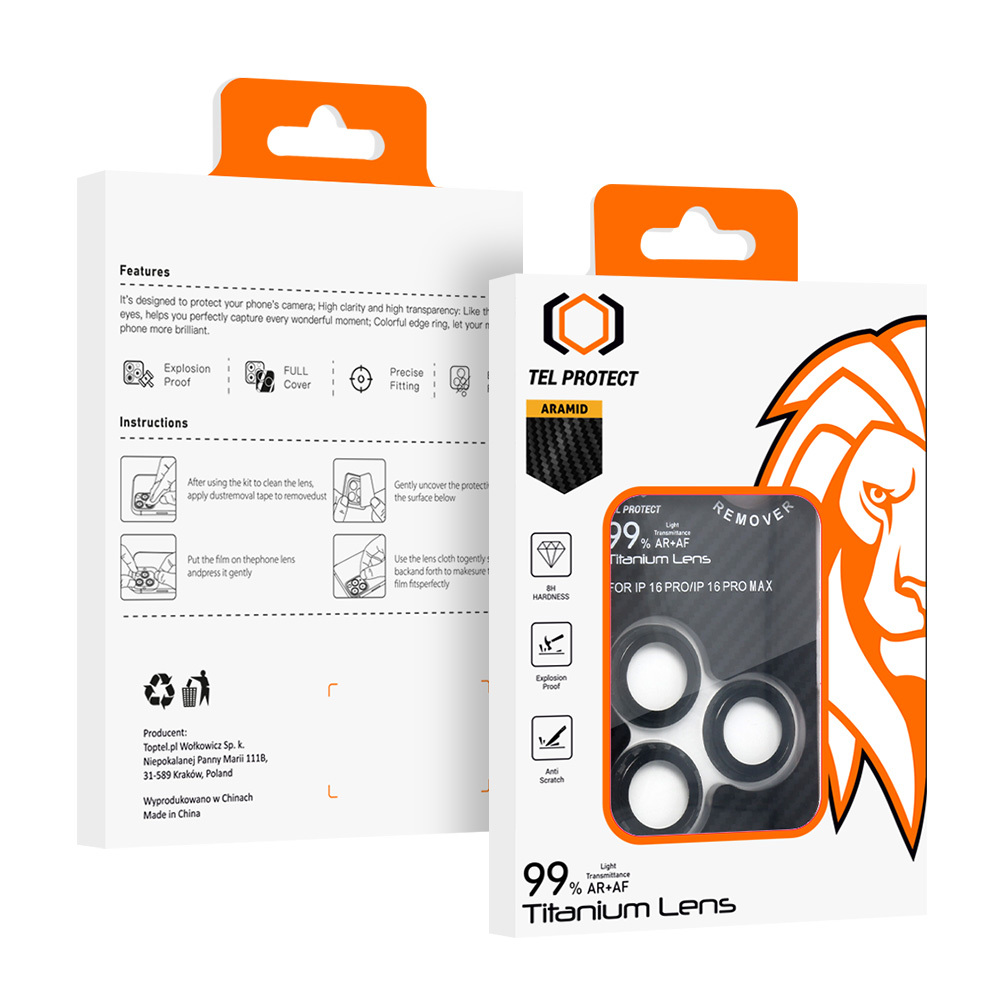 Tel Protect Aramid Lens 99% AR Edzett Üveg a Kamerához Végső Kamera Védelem - Aramid Kialakítás – Dekoratív gyűrű aramid rostokból, amely stílusos megjelenést és elegáns befejezést nyújt a kamera lencséje körül. - 99% AR Antireflexiós Bevonat – Csökkenti a fényszóródást és javítja a fénykép minőségét még kihívást jelentő fényviszonyok között is. Biztonság és Tartósság - Edzett Üveg – Megerősített szerkezete védi a lencsét a törésektől és ütésektől. - AF (Anti-Ujjlenyomat) – Minimalizálja a maszatolódásokat és ujjlenyomatokat, tisztán tartva a lencséket. Elegáns és Precíz Kialakítás - Precíz Illeszkedés – Vékony 0,2 mm-es profilja tökéletesen illeszkedik a legtöbb telefontokhoz. - Könnyű Telepítés – Speciális applikátor biztosítja az üveg gyors és pontos elhelyezését. Termék Specifikációja - Anyaga: Aramid rostok + edzett üveg - Vastagság: 0,2 mm