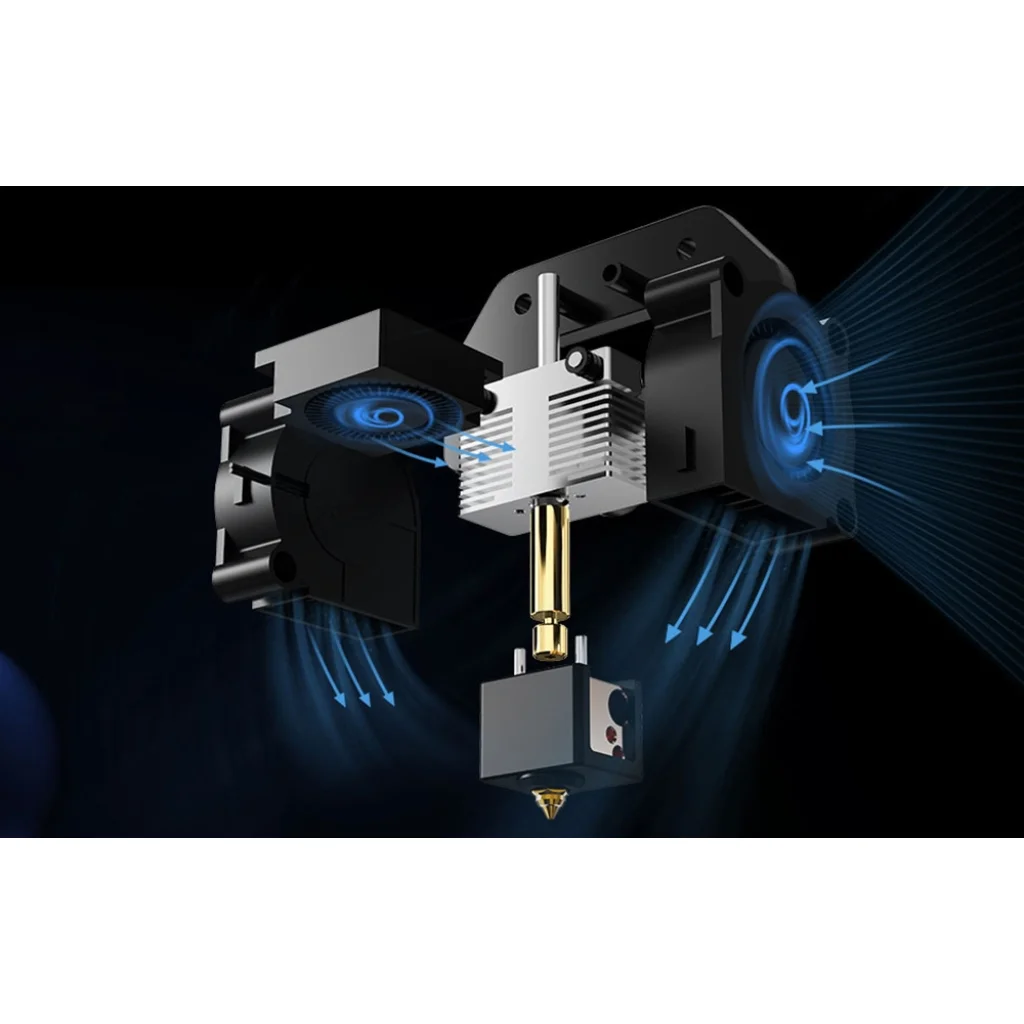 Továbbfejlesztett hotend és extruder: A nagy teljesítményű, kettős fogaskerék-elosztású, direkt típusú extruder precíz és stabil filament adagolást biztosít, míg a továbbfejlesztett hotend réz-titán hőcsövet és 300°C-os fúvókát alkalmaz.