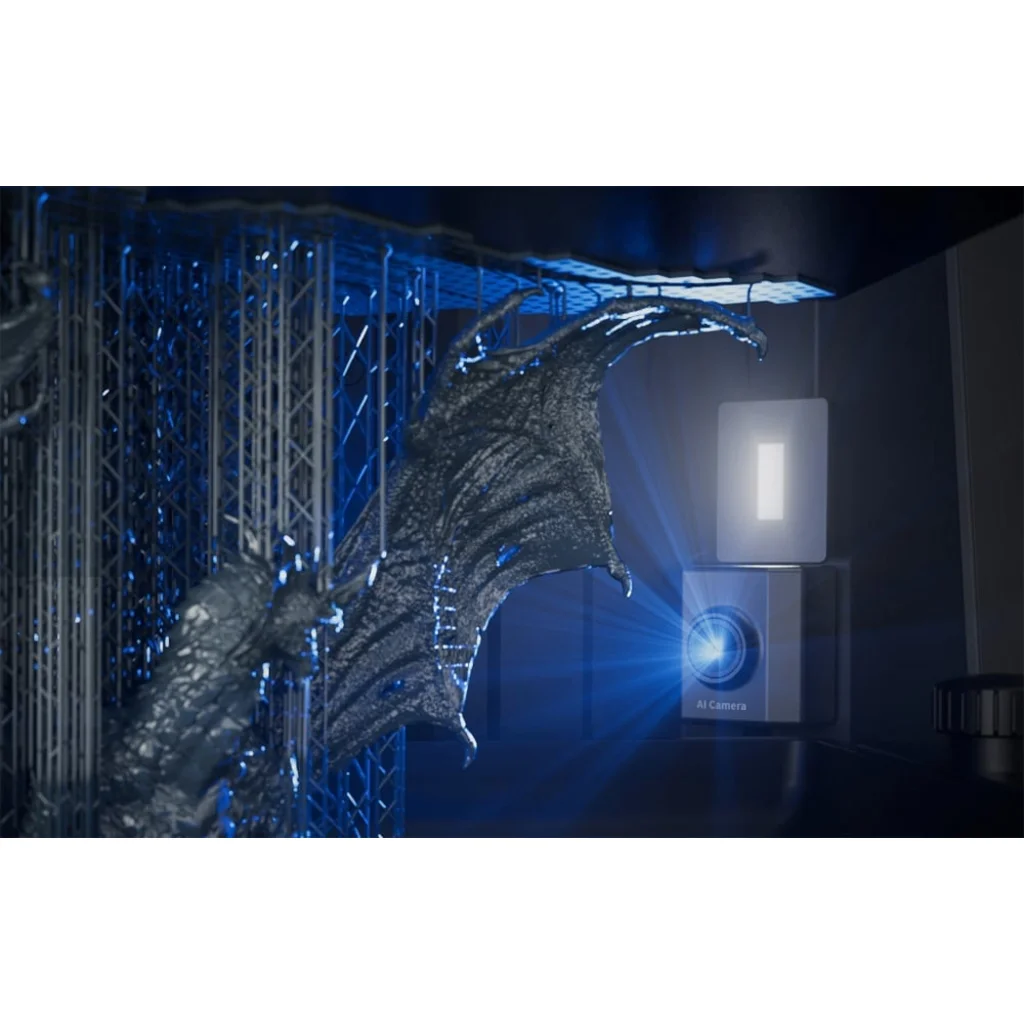A nyomtatás közbeni váratlan hibák anyagpazarláshoz és hosszabb futási időhöz vezethetnek. A Saturn 4 Ultra 16K ezt a problémát a beépített AI-kamerával oldja meg, amely lehetővé teszi a nyomtatási folyamat valós idejű felügyeletét. A rendszer a munka minden egyes lépését elemzi, és figyelmezteti a felhasználót a lehetséges problémákra, például a nem megfelelő rétegtapadásra vagy a hiányzó anyagra. A kamera időzített felvételt is lehetővé tesz, így pontosan nyomon követheti a teljes modellkészítési folyamatot, és javíthatja a jövőbeli terveket.
