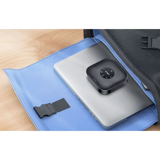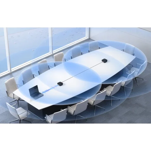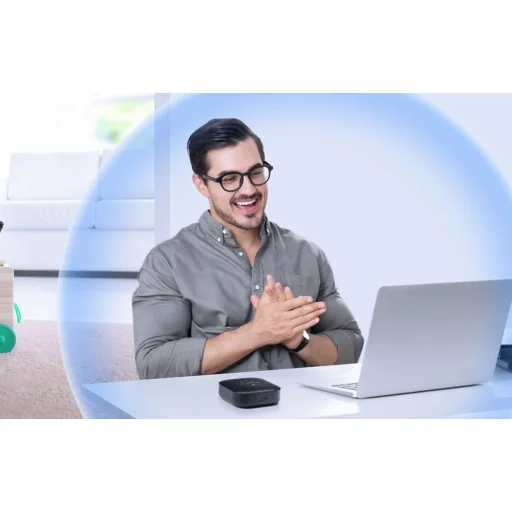 A 4 digitális MEMS mindenirányú mikrofon 360°-os lefedettséget biztosít, frekvenciatartománya 100 Hz és 10 kHz közé esik, hangfelvételi távolsága pedig akár 4,5 méter is lehet. A hangszóró csúcshangnyomásszintje 89 dB 0,5 méteren, frekvenciaátvitele pedig 20 Hz – 20 kHz (±3 dB), így kiválóan használható otthoni irodákban, kis tárgyalókban és közepes méretű helyiségekben is.