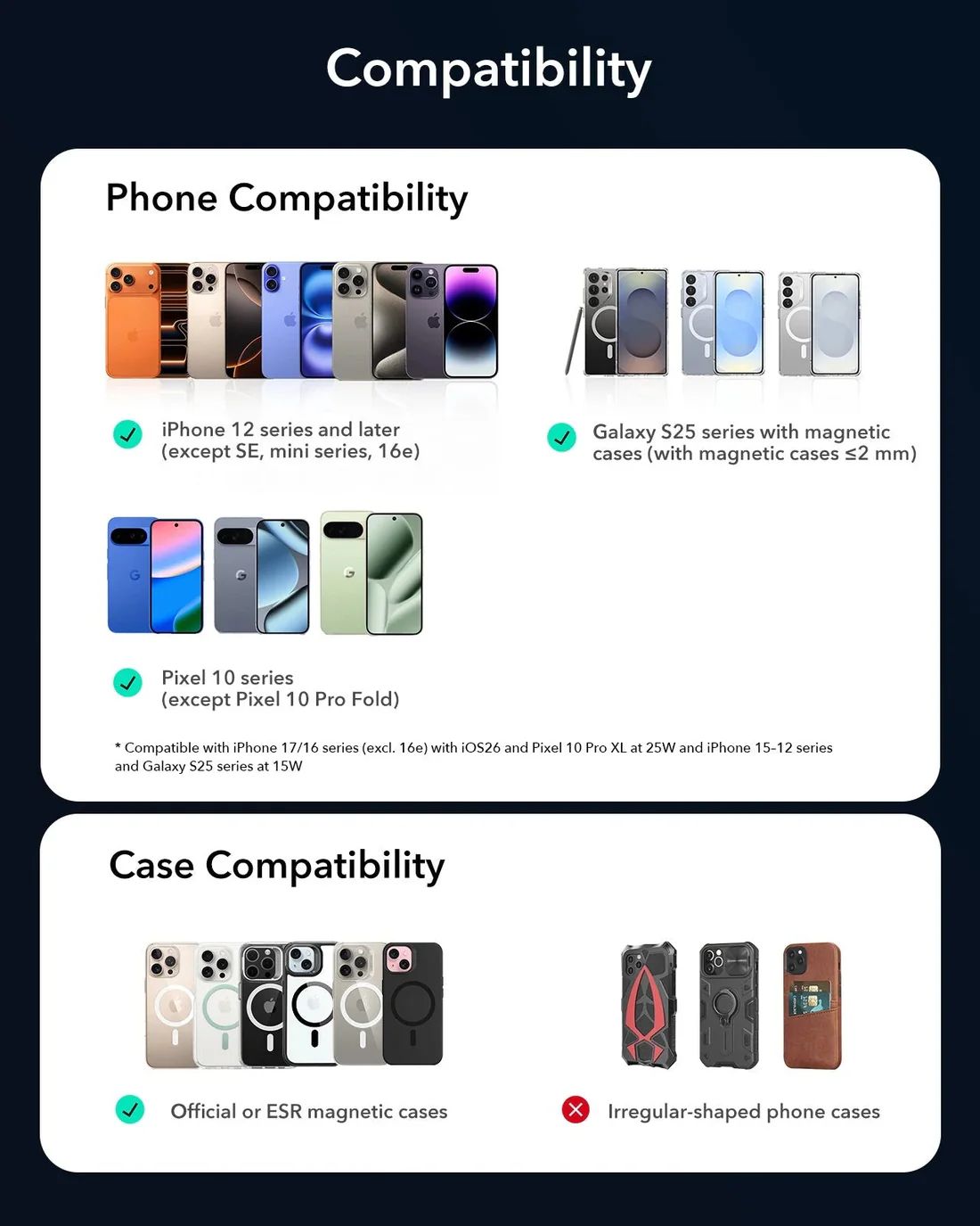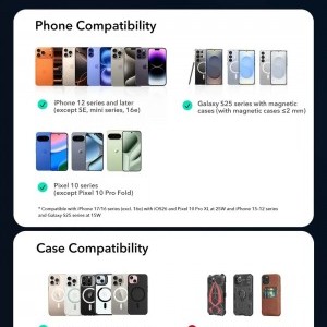 - iPhone: Kompatibilis az iPhone 12 sorozattal és későbbi modellekkel (kivéve SE, mini sorozat, 16e). Különösen az iPhone 17/16 sorozattal (16e kivételével, iOS 26 rendszerrel) és a Pixel 10 Pro XL modellekkel 25W-os töltésre képes, valamint az iPhone 15-12 sorozatokkal és a Galaxy S25 sorozattal 15W-os töltésre.