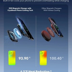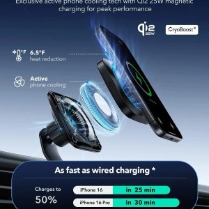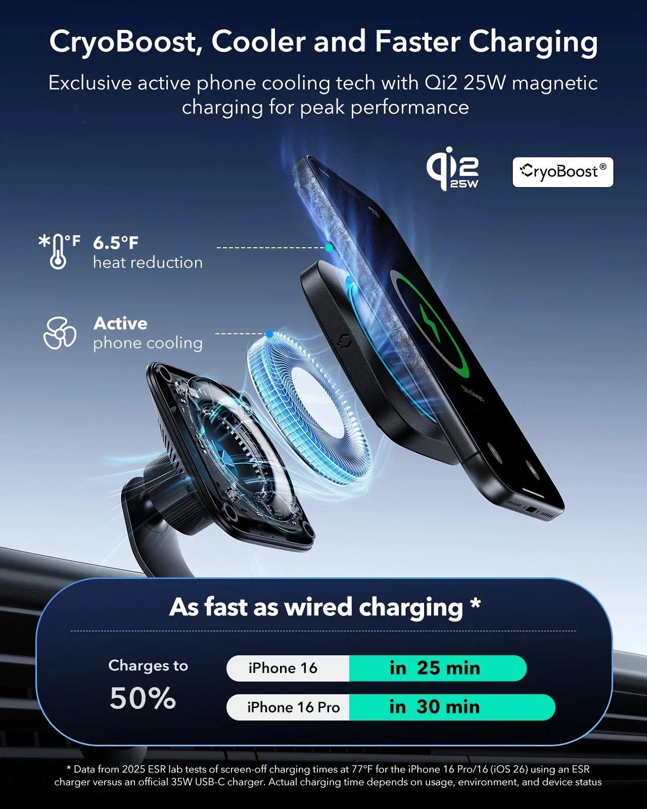 Az ESR OmniLock nem csupán egy telefontartó, hanem egy nagy teljesítményű, 25W-os Qi2 vezeték nélküli töltő is. Az exkluzív CryoBoost aktív hűtési technológia egy beépített ventilátor segítségével hűti telefonját töltés közben, megakadályozva a túlmelegedést. Ez a technológia akár 6,5°F (körülbelül 3,6°C) hőmérséklet-csökkenést eredményez a hagyományos, ventilátor nélküli mágneses töltőkhöz képest, meghosszabbítva akkumulátora élettartamát és optimalizálva a töltési teljesítményt.