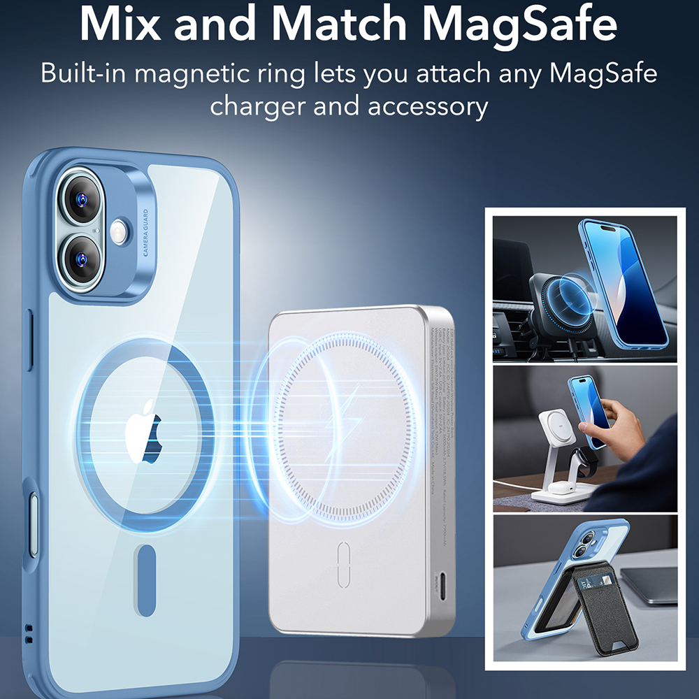 Az ESR Classic Hybrid HaloLock tok mindössze 1.6 mm vékony, így szinte észrevétlenül simul iPhone 16 készülékére, megőrizve annak karcsú vonalait és elegáns profilját. Az átlátszó hátlap engedi érvényesülni a telefon eredeti színét és designját, míg az átlátszó kék keret finom, mégis modern hangsúlyt ad.