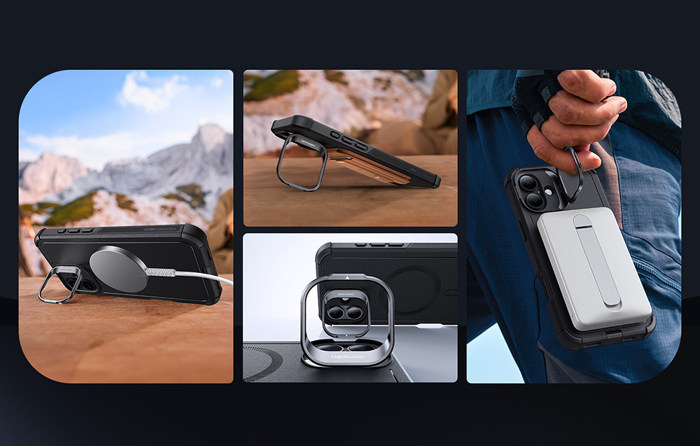 Az integrált állvány lehetővé teszi a telefon kényelmes elhelyezését különböző szögekben – álló és fekvő módban egyaránt. Továbbá a készüléket vezeték nélkül is töltheted anélkül, hogy eltávolítanád a tokot.