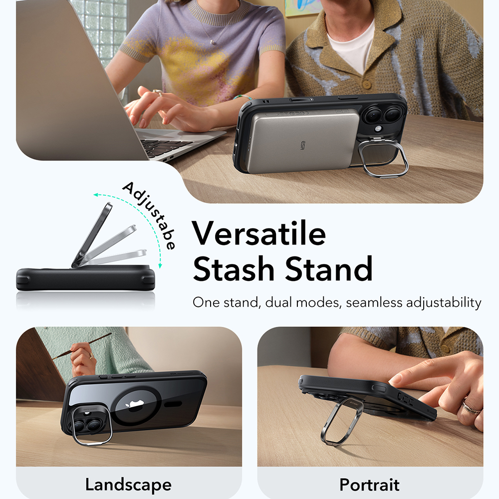 A beépített Versatile Stash Stand forradalmasítja a telefonhasználatot. Ez az egyedi kitámasztó kettős módban is használható, és teljesen fokozatmentesen állítható, így ideális szöget biztosít bármilyen tevékenységhez: