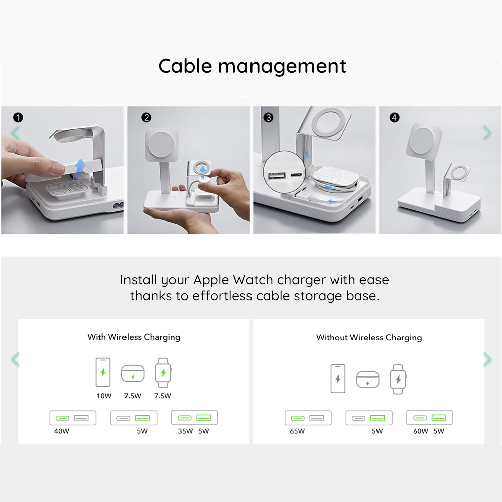 - Intelligens kábelrendezés: Az Apple Watch töltődhöz beépített, rejtett kábelvezetés található, így egyszerűen, elegánsan elrejtheted az óratöltő kábelét a töltőállomás alapjában, minimalizálva a rendetlenséget. A töltőállomásba az eredeti Apple Watch töltődet helyezheted be.