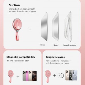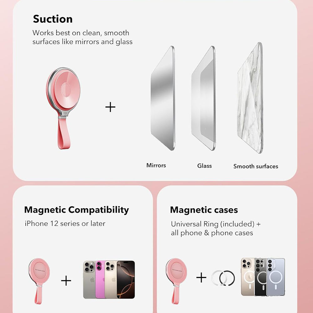 - Sokoldalú rögzítés: Az ESR továbbfejlesztett tapadókorongos technológiája kiválóan működik tiszta, sima felületeken, mint a tükrök, üvegfelületek, polírozott csempék vagy fémfelületek (például hűtőajtók). Ideális választás sminkeléshez, főzéshez, edzéshez, vagy videóhívásokhoz anélkül, hogy a kezét lekötné.