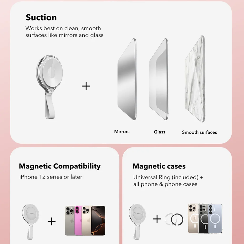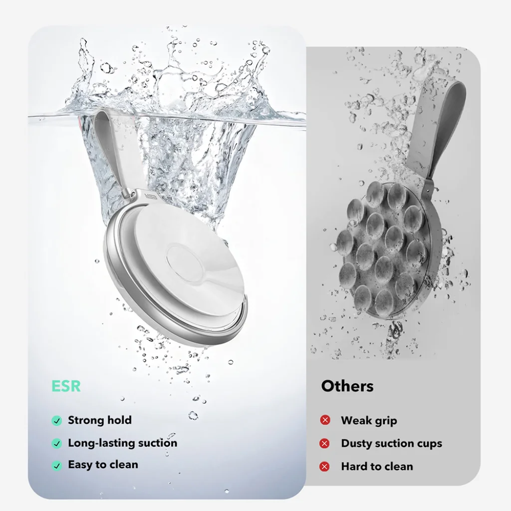 - Erős és megbízható tapadás: A HaloLock tartó kiválóan tapad sima és tiszta felületekre, mint például tükrök, üvegek, csempék, vagy akár márvány. Az ESR egyedülálló tapadási technológiájának köszönhetően a rögzítés rendkívül stabil, és akár 10-szer hosszabb ideig tart, mint a hagyományos tapadókorongos megoldásoknál. Ráadásul könnyedén tisztítható, így mindig megőrzi optimális tapadási képességét.