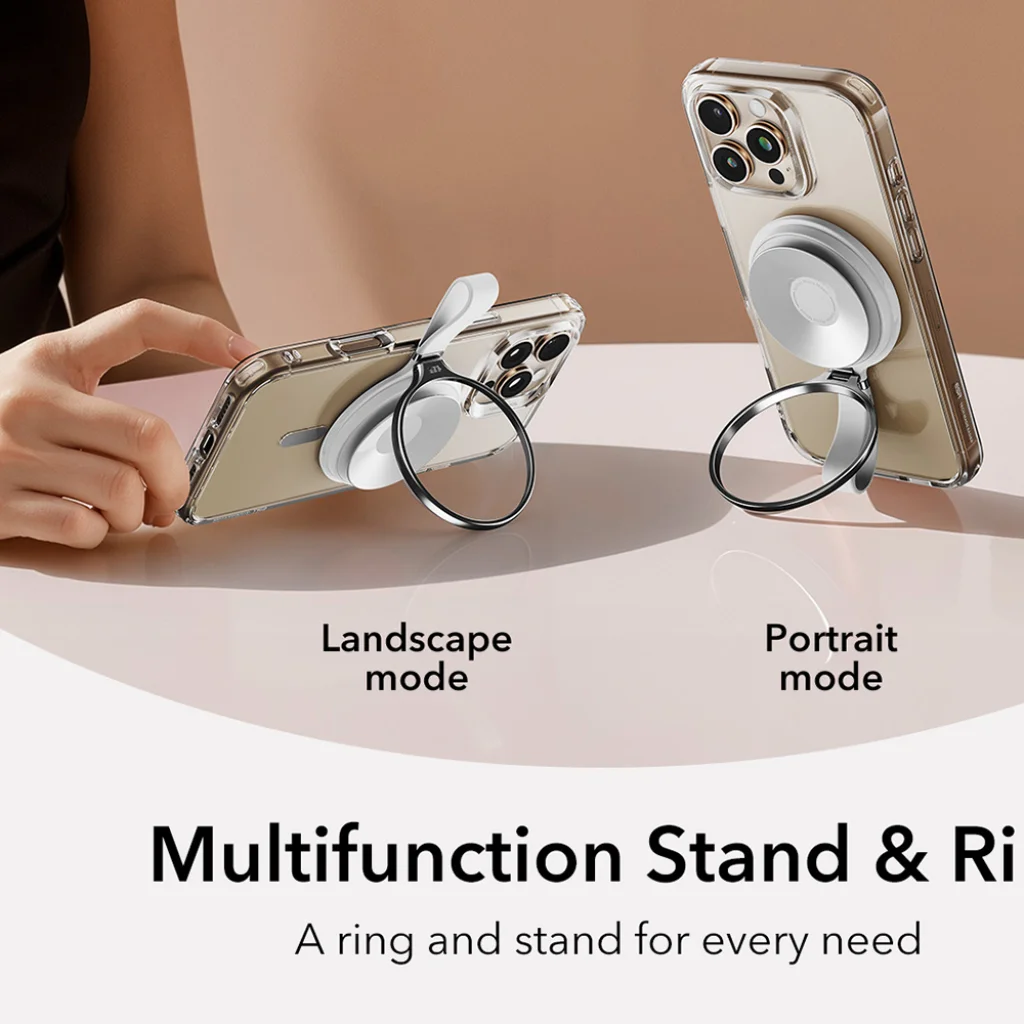 - Multifunkcionális állvány és gyűrű: Ez a kiegészítő nem csupán egy tapadókorongos tartó. A 360°-ban elforgatható gyűrűnek köszönhetően kényelmesen használható telefonállványként fekvő (landscape) és álló (portrait) módban is. Ideális videónézéshez, videóhívásokhoz vagy egyszerűen csak a tökéletes szög megtalálásához. A gyűrű ezen felül kényelmes és biztonságos fogást biztosít telefonjának.