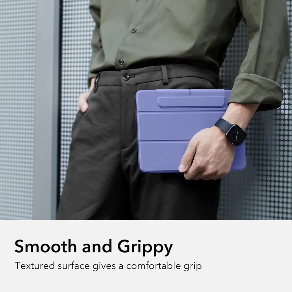 A tok texturált felülete nem csak elegáns megjelenést kölcsönöz, hanem kiváló, kényelmes fogást is biztosít. Így az iPad biztonságosan és kellemesen fekszik a kézben, csökkentve a véletlen leejtés kockázatát.