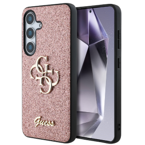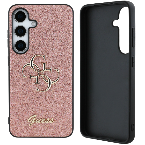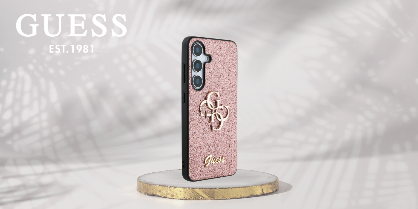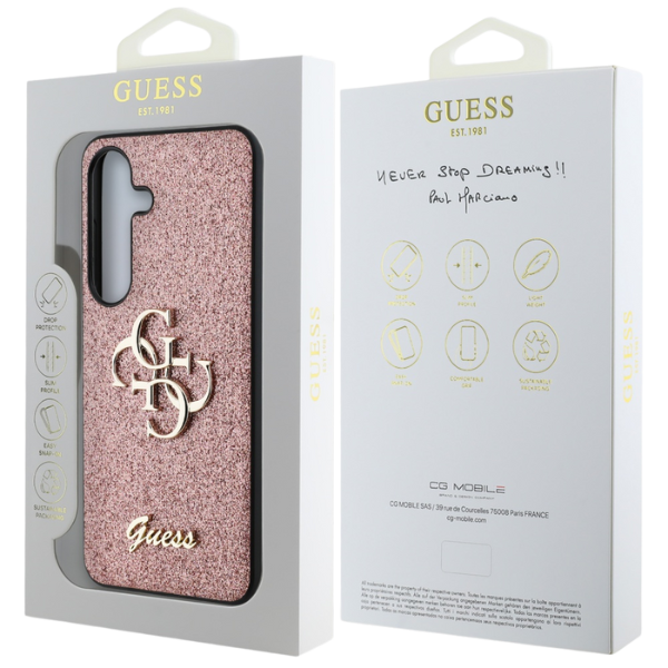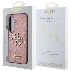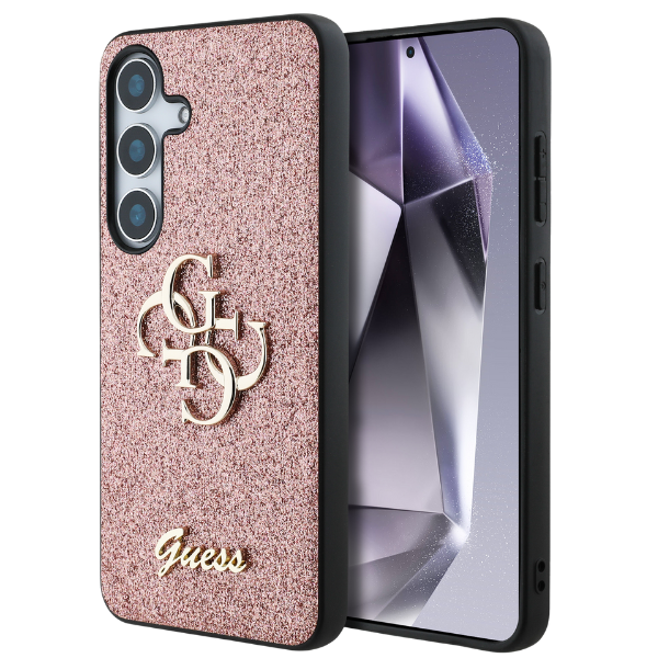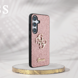 Guess csillámos tok a Rögzített Csillámos Nagy 4G Fém Logós kollekcióból, amelyet az elegáns, jól felismerhető 4G minta jellemez, arany GUESS logóval szignálva.