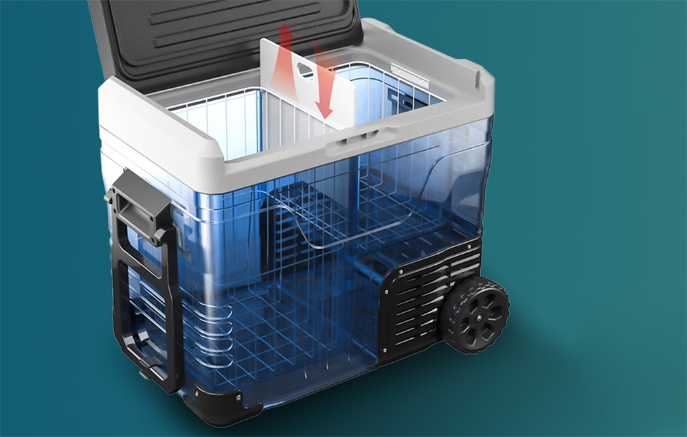 Két belső kosárral és egy kivehető rekesszel rendelkezik, amely vágódeszkaként is szolgálhat. Ez a megoldás segít rendben tartani a hűtőszekrényt, és lehetővé teszi, hogy kényelmesen elkülönítse például a gyümölcsöket az italoktól vagy a száraz termékeket a hűtöttektől. A belső tér szervezése az Ön igényeihez igazodik. Ráadásul a hűtőszekrény nagyméretű, terepjáró kerekekkel és kihúzható fogantyúval van felszerelve, így fáradtság nélkül megoldható a homokon, kavicson vagy füvön való szállítás.