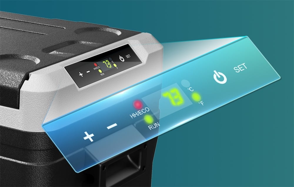 Az érintőképernyős kezelőpanel lehetővé teszi a hőmérséklet változtatását, az üzemmód beállítását és a működés valós idejű ellenőrzését. Emellett a külön erre a célra kifejlesztett alkalmazásnak köszönhetően okostelefonjáról is vezérelheti a készüléket - ez különösen kényelmes, ha a hűtőszekrényt egy jármű hátsó részében vagy egy sátorban helyezi el.