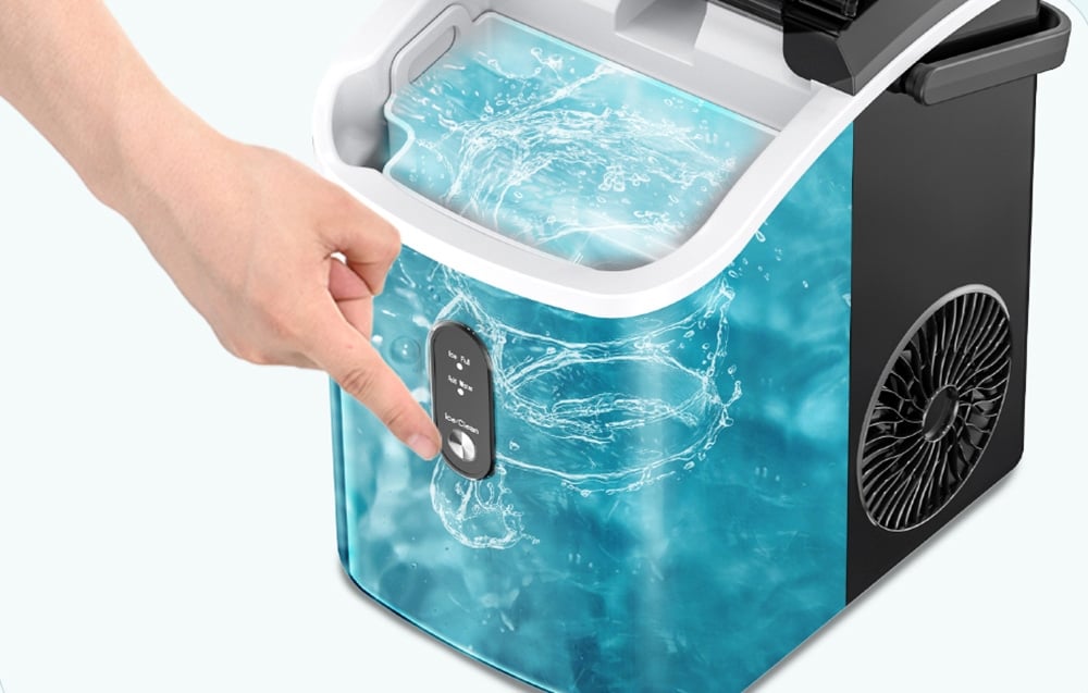 A higiénia fenntartása rendkívül egyszerű az automatikus tisztítási funkcióval. Csak tartsa lenyomva az ICE/CLEAN gombot 3 másodpercig a tisztítóprogram elindításához, amely átöblíti a kockakészítő belsejét, és előkészíti a további működésre. Ez nagy kényelmet jelent - nem kell szétszednie vagy kézzel tisztítania a nehezen hozzáférhető területeket.