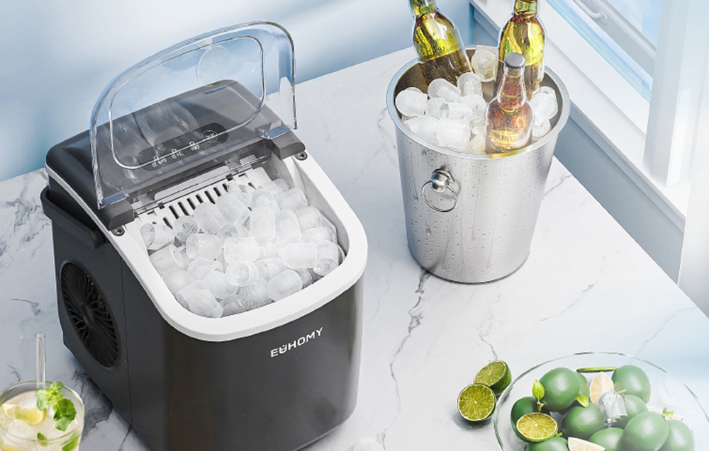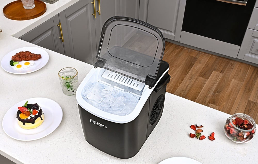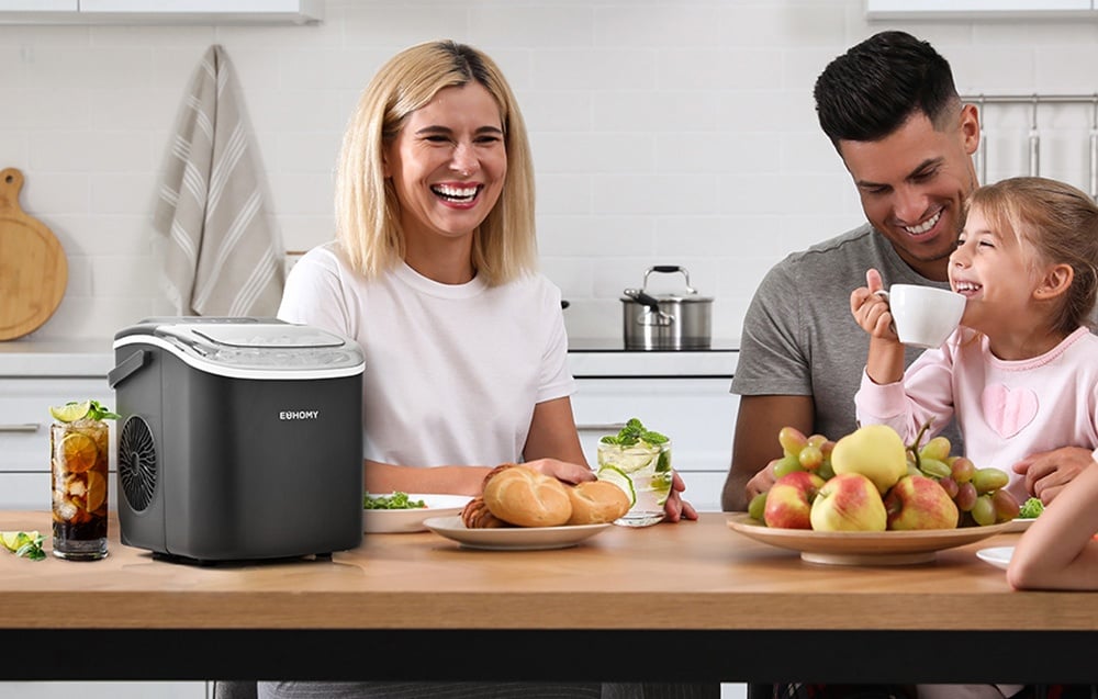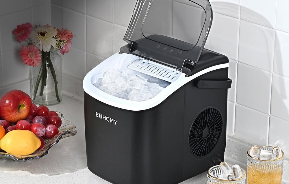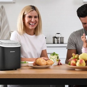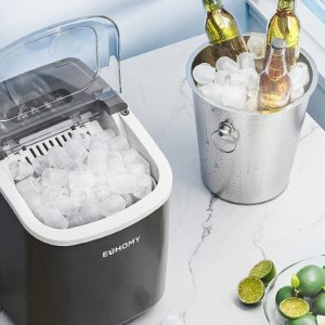 Az Euhomy IM06D jégkészítő egy kompakt jégkockakészítő, amely mindössze 6 perc alatt állít elő jeget - telepítés és vízcsatlakozás nélkül. A készülék jellegzetes kockákat állít elő, amelyek lassan olvadnak és nem ragadnak össze. Ideális nyári napokra, társasági összejövetelekre, kempingezésekre vagy a konyhában való használatra.