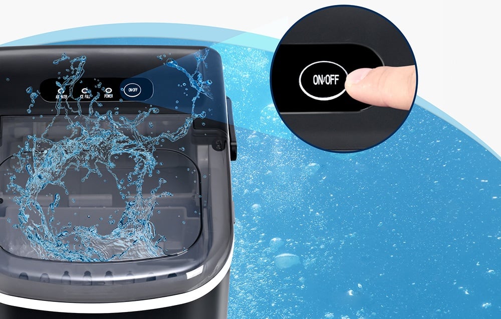 Automatikus tisztítási funkció: A készülék öntisztító üzemmóddal van felszerelve - csak tartsa lenyomva az ON/OFF gombot 5 másodpercig. Az egész folyamat kb. 30 percet vesz igénybe, a vizet pedig a beépített lefolyón keresztül engedheti le. A rendszeres tisztítás jobb jégminőséget és hosszabb élettartamot biztosít a készüléknek.