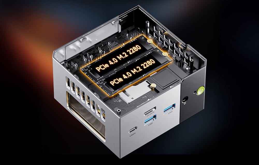 A 2280-as szabvány szerinti két PCIe 4.0 M.2 NVMe (Non-Volatile Memory Express, az SSD-k protokollja, amely villámgyors olvasást és írást garantál minimális késleltetéssel) bővítőhely lehetővé teszi SSD (Solid State Drive, félvezető meghajtó, amely nagy sebességű adatolvasást és -írást biztosít) adathordozók telepítését akár 1 TB összkapacitással, miközben a másodpercenként több ezer megabájtos átvitel minimálisra csökkenti az alkalmazások betöltési idejét. A PCIe 3.0 és 4.0 (Peripheral Component Interconnect Express, az alaplapot a kulcsfontosságú komponensekkel, például a grafikus kártyákkal és a hálózati vezérlőkkel összekötő bővítőbusz-szabvány) támogatása garantálja a meghajtók széles skálájával való kompatibilitást, az OCuLink (Optical-Copper Link, lehetővé teszi a PCIe vonalak hatékony kiterjesztését a számítógépházon kívülre réz- vagy optikai kábelek segítségével) 64 Gbps sebességgel, így külső grafikus kártyát csatlakoztathat, és az EVO-X1-et mobil munkaállomássá alakíthatja.