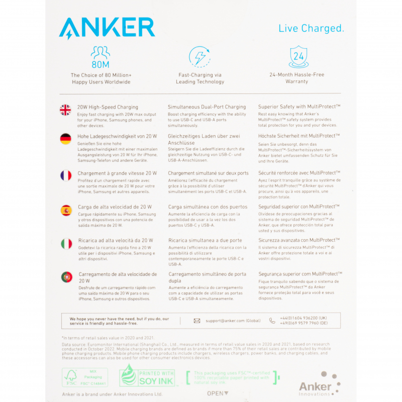 Az Anker saját fejlesztésű MultiProtect rendszere átfogó védelmet biztosít eszközeid számára. Ez magában foglalja a túlfeszültség-védelmet, a hőmérséklet-szabályozást, az áramszabályozást és számos egyéb biztonsági funkciót, hogy a töltés mindig biztonságos és megbízható legyen. Az Anker több mint 80 millió elégedett felhasználóval büszkélkedhet világszerte.