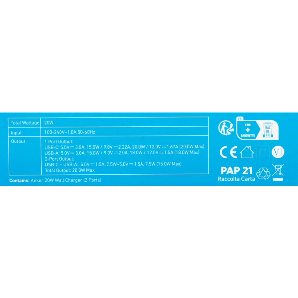 - Termék megnevezése: Anker 312 fali töltő, 20W, 3A, 1 x USB-A - 1 x USB-C, Fehér A2348G21
