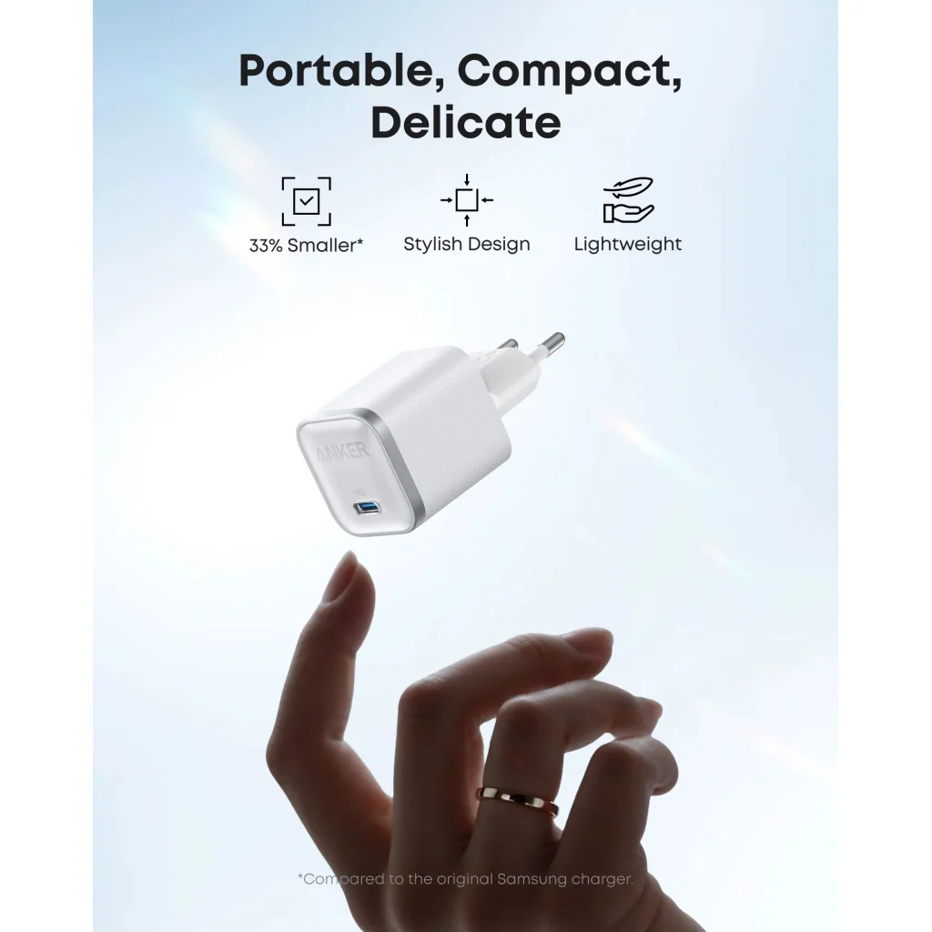 Az Anker Nano 45W nem csupán erős, de rendkívül praktikus is. A modern és visszafogott fehér design, a jellegzetes texturált felület és a letisztult vonalak kiemelik a termék prémium minőségét. Ez a töltő 33%-kal kisebb*, mint az eredeti Samsung töltők, így alig foglal helyet a táskádban vagy zsebedben, ideálissá téve a mindennapi használatra és utazáshoz.