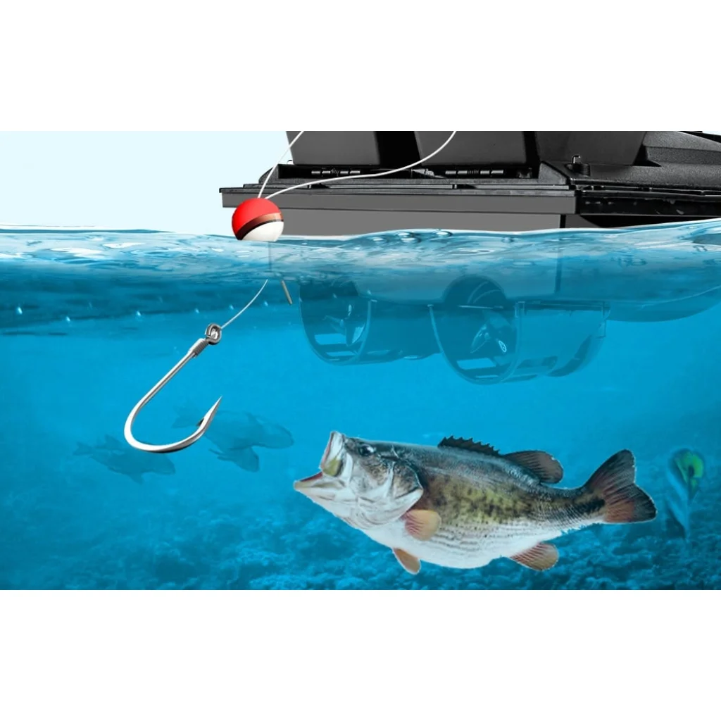 A csónak hátsó részén két horog található, amelyek lehetővé teszik a horoggal ellátott szerelékek rögzítését. Ennek köszönhetően nemcsak az etetőanyag, hanem a horoggal ellátott csali is pontosan a halak tartózkodási helyére juttatható, növelve a horgászat hatékonyságát és csökkentve a kapásra várakozás idejét.