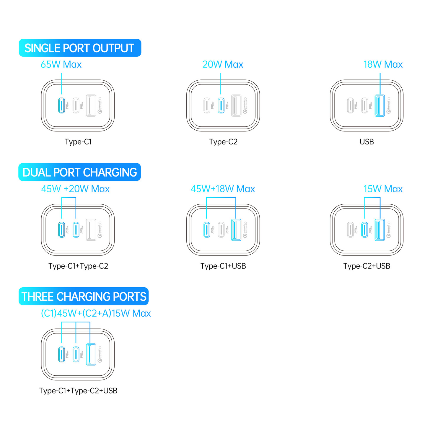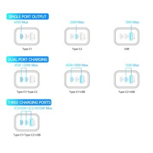 - Többportos töltés: C1 (45W) + C2 (20W) = 65W Max | C1 (45W) + A1 (18W) = 63W Max