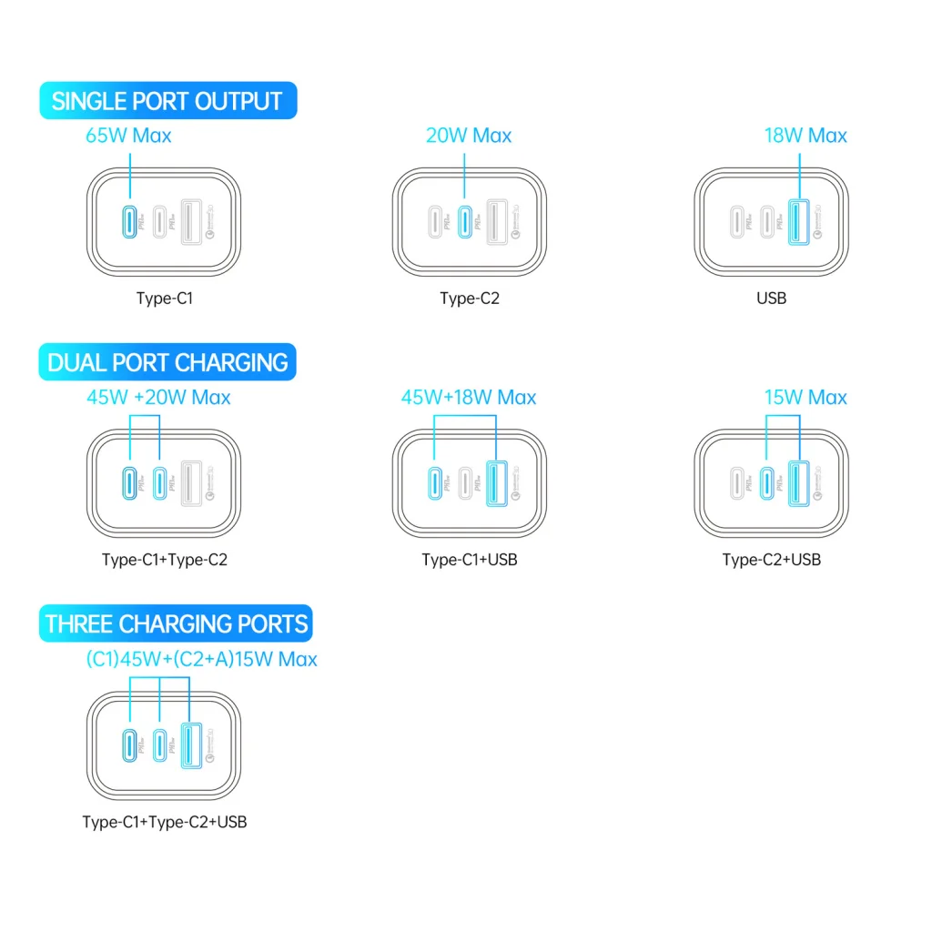 - Többportos töltés: C1 (45W) + C2 (20W) = 65W Max | C1 (45W) + A1 (18W) = 63W Max