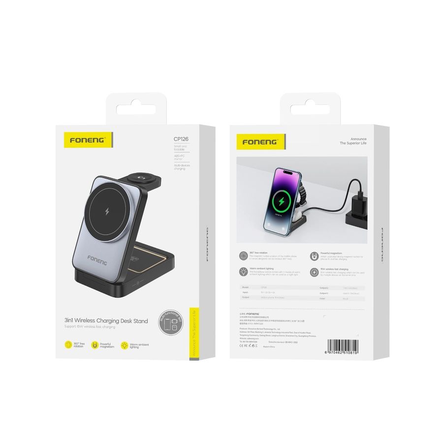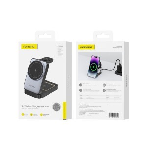 A FONENG CP126 egy kiválóan hordozható és sokoldalú 3 az 1-ben vezeték nélküli töltőállomás, amely elegáns designnal és erőteljes töltési képességekkel rendelkezik. Tökéletes megoldás, ha útközben vagy otthon szeretnél több eszközöd gyorsan és kényelmesen tölteni. Kompakt, összecsukható kialakításának köszönhetően könnyedén magaddal viheted bárhová, így mindig kéznél van, amikor szükséged van rá.