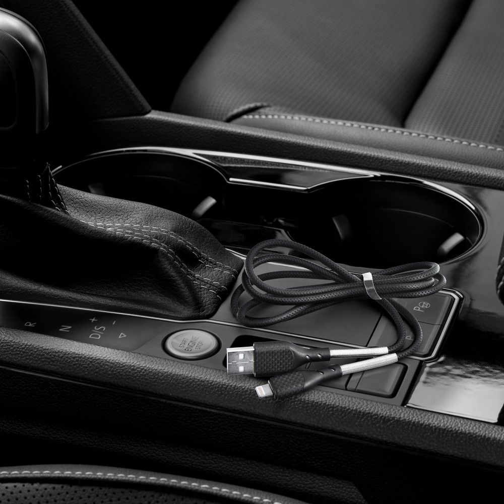 Erős multimédiás kábel töltéshez és adatátvitelhez. Támogatja az Apple CarPlay-t. A dugók végei fémfonattal erősítettek meg. A maximális teljesítmény 12 W.