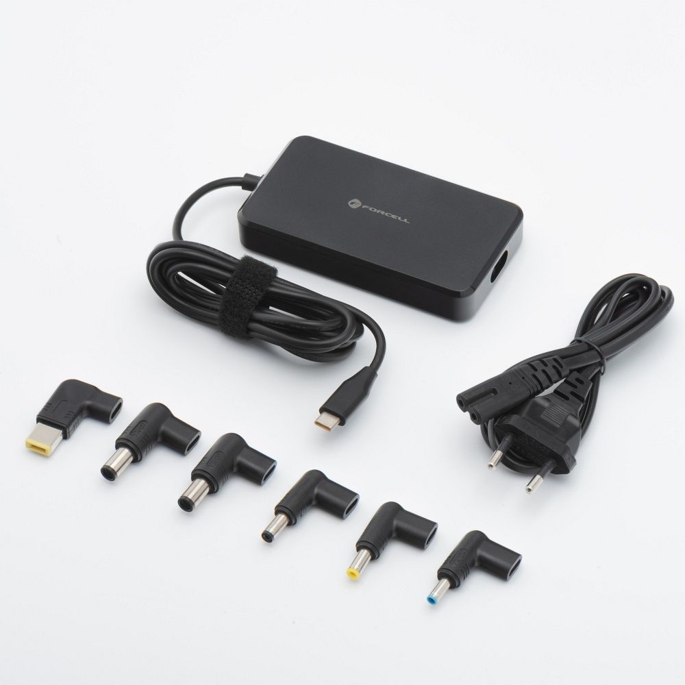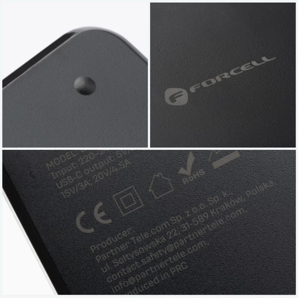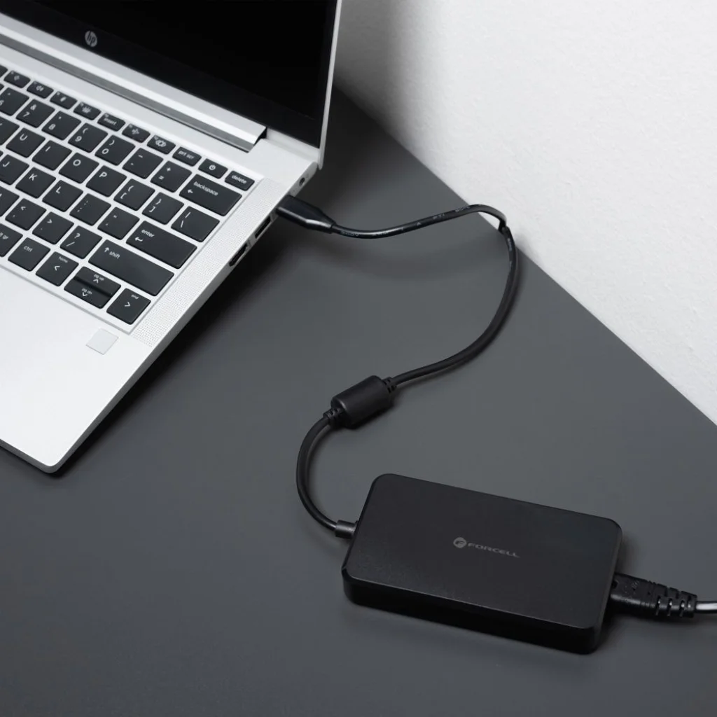A Forcell E856 a modern kor igényeinek megfelelően egy rögzített USB-C kábellel érkezik, amely közvetlenül csatlakozik laptopjához, így nincs szükség további, zavaró kábelekre. Ez a letisztult és praktikus kialakítás megfelel a legújabb töltési szabványoknak, biztosítva a zökkenőmentes használatot.