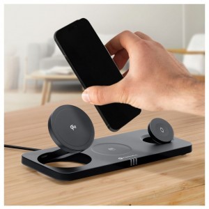 A MagSafe® kompatibilitásnak köszönhetően a töltő lehetővé teszi egy iPhone®, Apple Watch® és AirPods® vagy más márkájú eszközök egyidejű töltését. Ez a praktikus megoldás segít rendet tartani a munkahelyen és időt takarít meg, ideálissá téve otthoni és irodai használatra egyaránt. Fontos, hogy sok töltő csökkenti a töltési teljesítményt más eszközök számára, amikor iPhone®-t töltünk. A MagNetix töltő teljes 20,5 W teljesítményt biztosít mindhárom eszköz számára egyszerre.