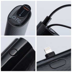 A Forcell F-Energy Power Plug nemcsak erőteljes, hanem kivételesen praktikus és elegáns is. Fekete, texturált felülete modern megjelenést kölcsönöz, míg rendkívül kompakt méretei (79.1 × 51 × 25 mm) és mindössze 100.7 grammos súlya révén könnyedén elfér a zsebedben, táskádban vagy akár egy kisebb ridikülben is, ahogy a képeken is látható. A beépített, védőkupakkal ellátott Lightning® csatlakozó és a praktikus, integrált USB-C kábel (amely a powerbank töltésére és eszközök töltésére is alkalmas) garantálja a maximális kényelmet – soha többé nem kell aggódnod a kábelek elvesztése vagy otthon felejtése miatt. A powerbank egy strapabíró hurokkal is felszerelt, ami további hordozhatóságot és rögzítési lehetőséget biztosít, így valóban „Always Onboard”, azaz mindig veled lehet.