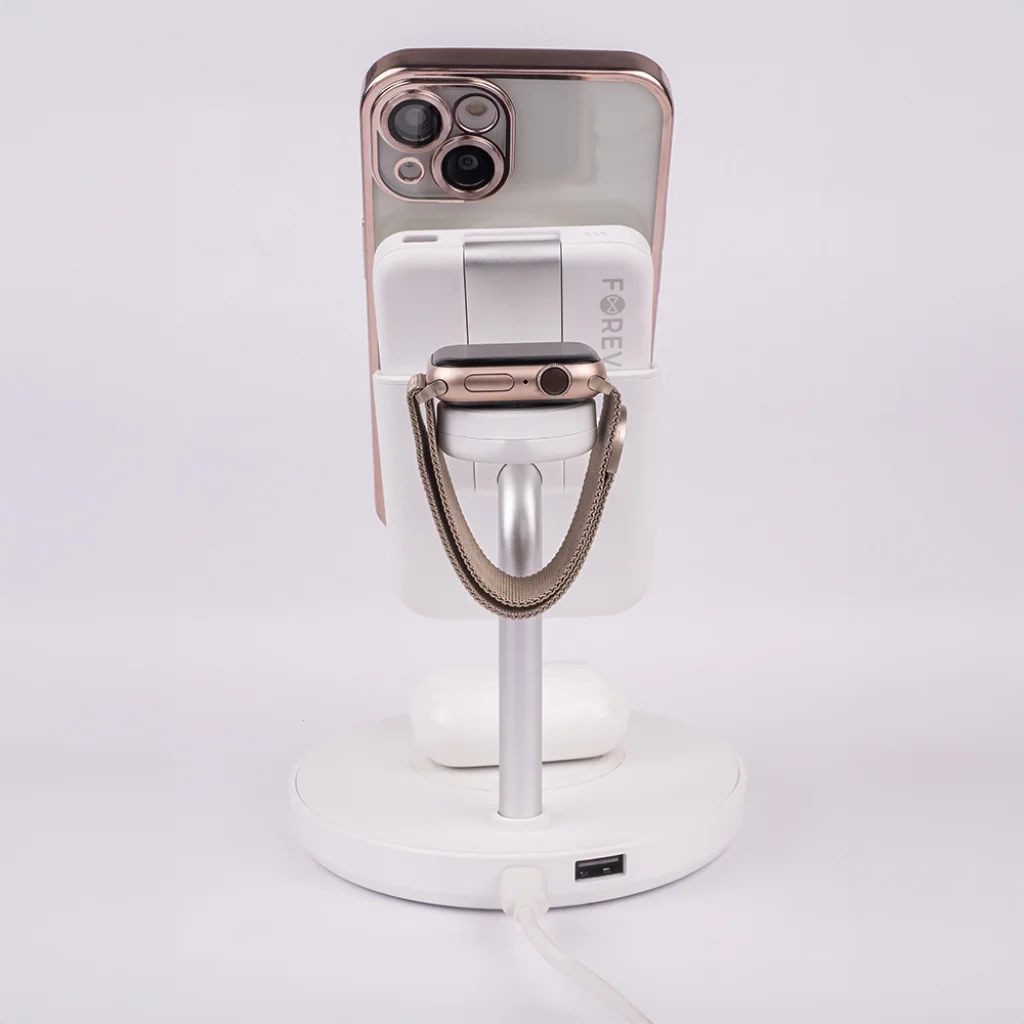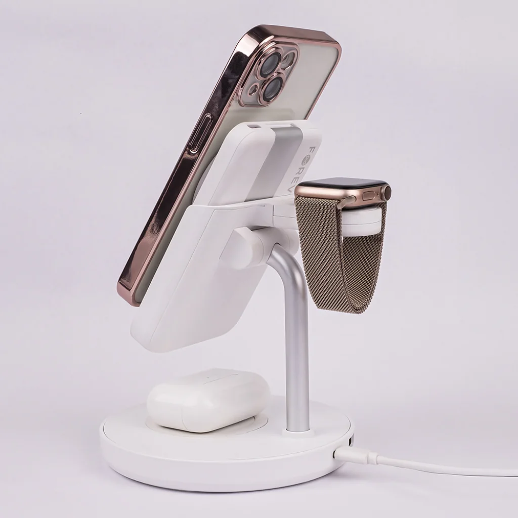 A MACS-100 mágneses vezeték nélküli töltőállomás power bankkal fehér 5in1 egy sokoldalú töltő, amely lehetővé teszi 3 eszköz egyidejű töltését. A MagSafe és a vezeték nélküli töltést támogató telefonokkal való kompatibilitása zökkenőmentes töltést biztosít a különböző eszközmodellek számára. Beépített USB-A porttal is rendelkezik.