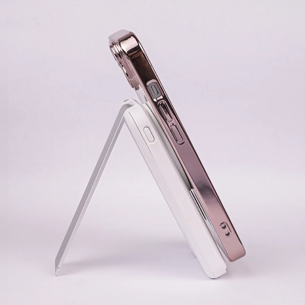 A power bank az AirPods fülhallgatókat is töltheti MagSafe segítségével, és praktikus lábbal van felszerelve, amely állványként működik a telefon töltése közben, növelve a készülék funkcionalitását.
