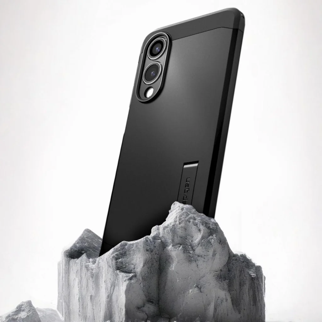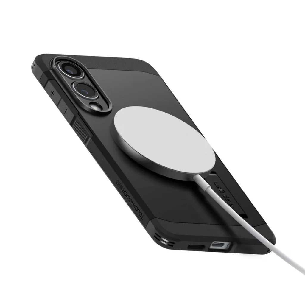 A Spigen márkájú Tough Armor sorozatú tok a korábbi verzió továbbfejlesztett változata. A tok mágneses gyűrűvel van ellátva, amely kompatibilis a MagSafe rögzítési és vezeték nélküli töltési rendszerrel, amely gyors és egyszerű használatot biztosít az Apple technológiával. Kétrészes kialakítása kopásálló termoplasztikus anyagból és megerősített polikarbonát keretből készült. A tok belsejében található egy technológiai habanyag kitöltés, amely extra védelmet nyújt az ütések és esések ellen. A tok tökéletesen illeszkedik, és nem korlátozza a vezeték nélküli töltés lehetőségét. Kissé megemelt forma a kamera és a képernyő körül védi azt a karcolásoktól, a telefont éppen a sík felület fölé emelve. Rendelkezik gombvédőkkel és port kivágásokkal.