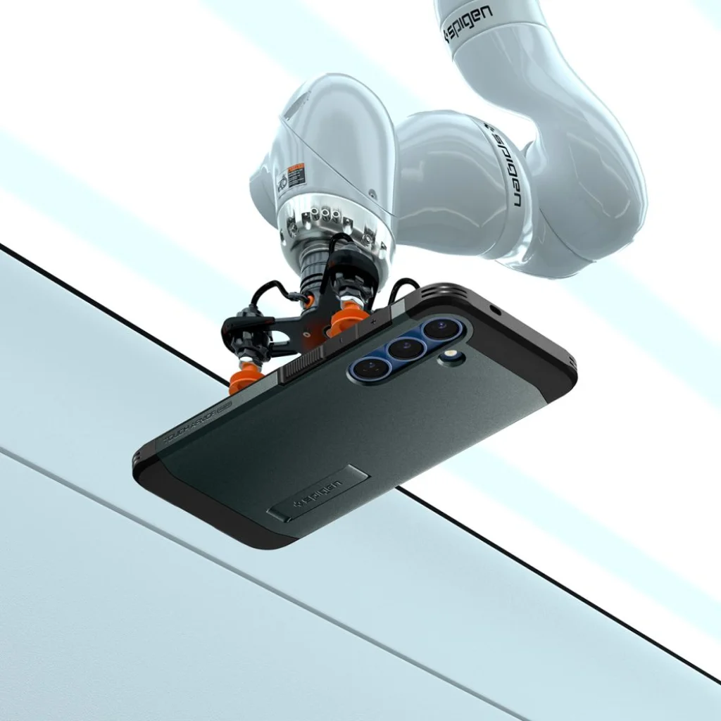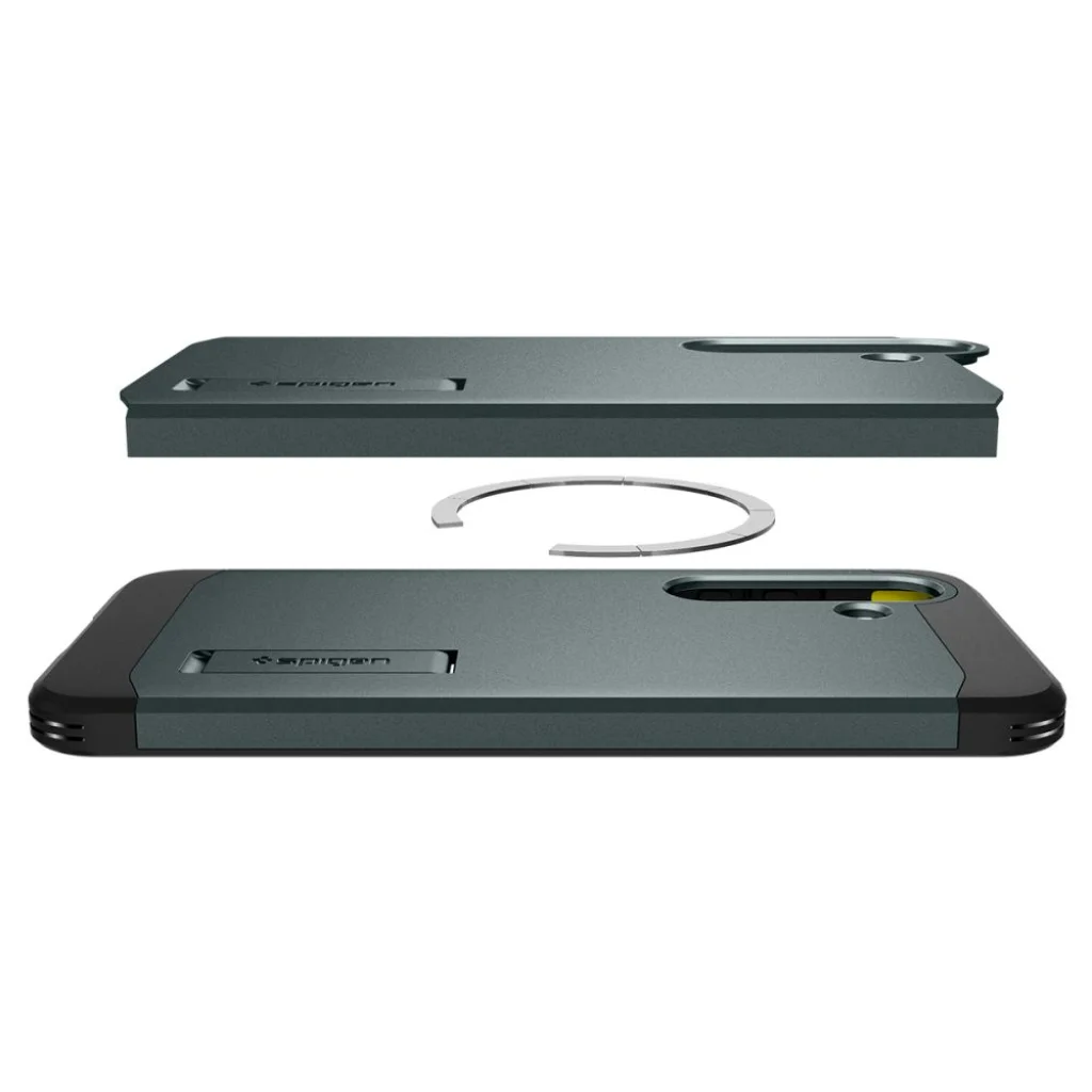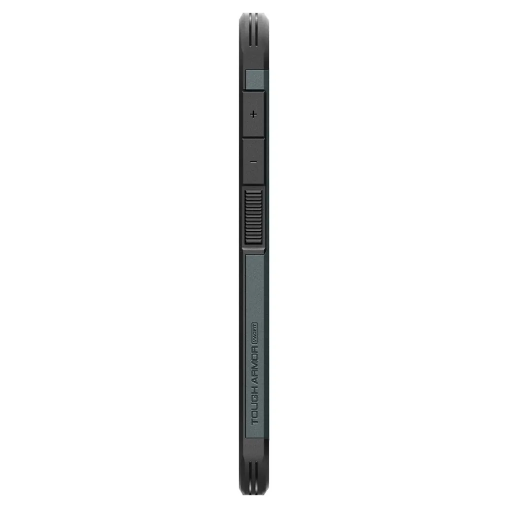 A Spigen márkájú Tough Armor sorozat tokja egy továbbfejlesztett változata elődjének. A tok mágneses gyűrűvel van felszerelve, amely kompatibilis a MagSafe rögzítőrendszerrel és vezeték nélküli töltéssel, lehetővé téve az Apple technológia gyors és egyszerű használatát. Két részből álló felépítése kopásálló termoplasztikus anyagból és megerősítő polikarbonát keretből készült. A tok belsejében technológiai hab található, amely extra védőréteget biztosít az ütések vagy esések ellen. A tok tökéletesen illeszkedik és nem korlátozza a vezeték nélküli töltést. Az enyhén megemelt tokforma a kamera és a kijelző körül védi a karcolásoktól, felemelve a telefont a sík felület fölé. Gombvédőkkel és portok kivágásaival rendelkezik. A Tough Armor tokot 26 alkalommal tesztelték leejtés teszttel 1,2m magasságból, amellyel megszerezte az amerikai katonai tanúsítványt, a MIL-STD 810G-516.6-ot.