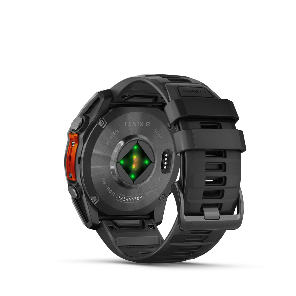 A Garmin fenix 8 tartós kialakítással bír, rozsdamentes acélból készült házzal és karcálló kijelzővel. Az intuitív fizikai gombok, beleértve a jellegzetes narancssárga akció gombot, még nedves vagy kesztyűs kézzel is könnyű kezelhetőséget biztosítanak. Az 51 mm-es tok mérete és a strapabíró fekete szilikon szíj kényelmes viseletet garantál a legintenzívebb edzések során is.