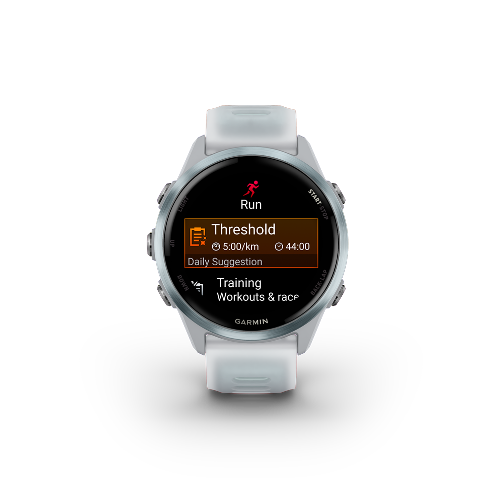 - Személyre szabott edzésjavaslatok: A Forerunner 570 naponta javasol számodra edzéseket, figyelembe véve az aktuális edzettségi szintedet és regenerációdat. Legyen szó küszöbedzésről (például 5:00/km tempó 44 percig) vagy általános futásról, az óra mindig a megfelelő kihívást kínálja, segítve az optimális fejlődést.