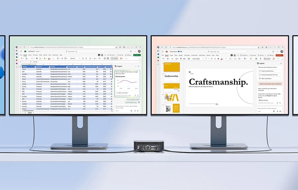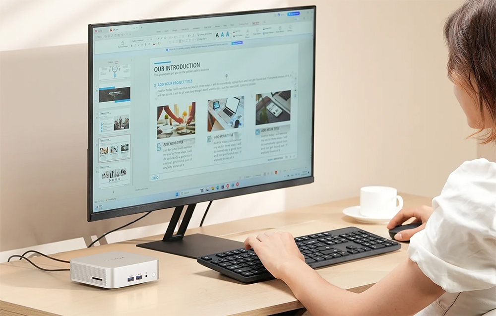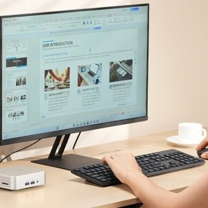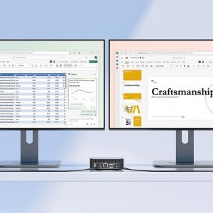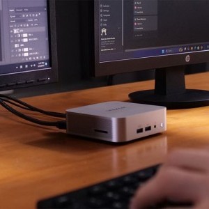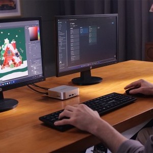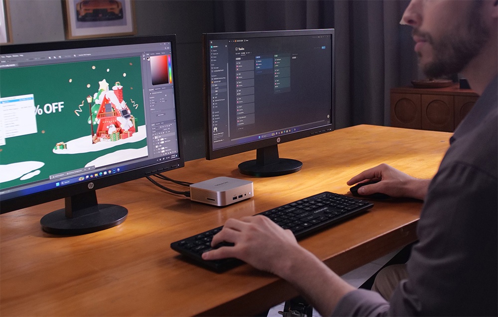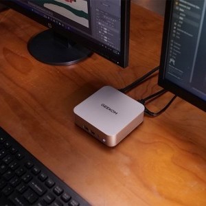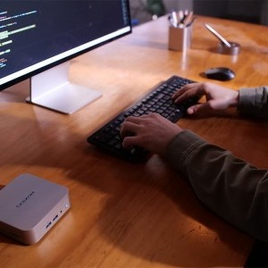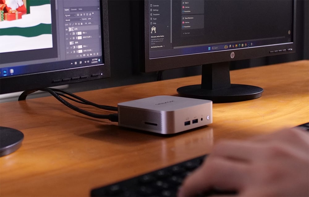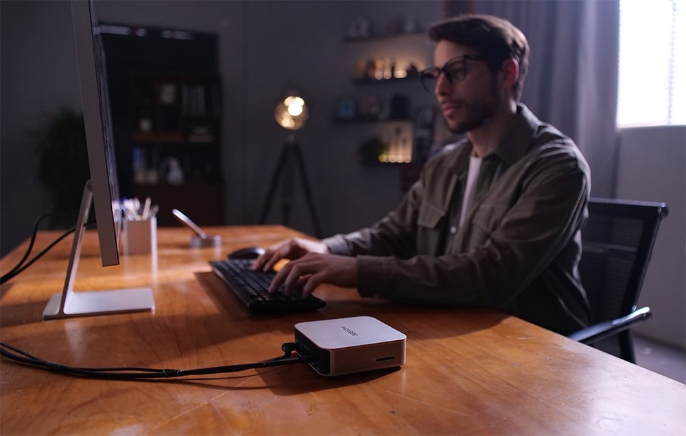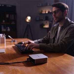 A mini PC kialakítása lehetővé teszi több eszköz egyidejű csatlakoztatását. A 2 HDMI 2.0 port és a 2 USB-C port akár 4 monitort is támogat 4K minőségben. Az USB 4.0 Gen 3 port nagy sebességű adatátvitelt és a csatlakoztatott eszközök tápellátását biztosítja. A további USB 3.2 és USB 2.0 portok lehetővé teszik a különböző kiegészítőkkel való munkát, az SD-kártyaolvasó pedig megkönnyíti a fájlok átvitelét fényképezőgépekről és videokamerákról.