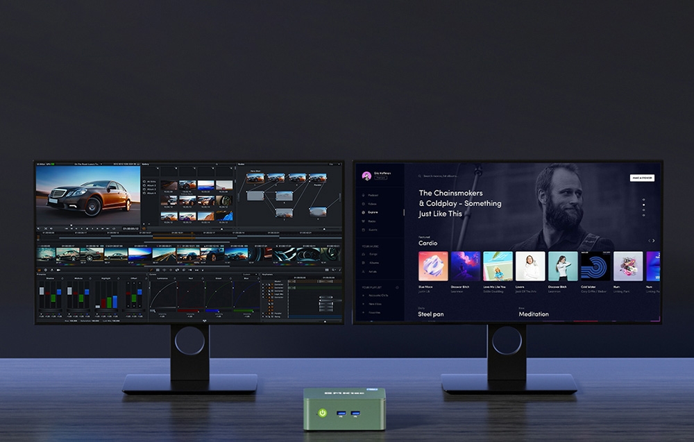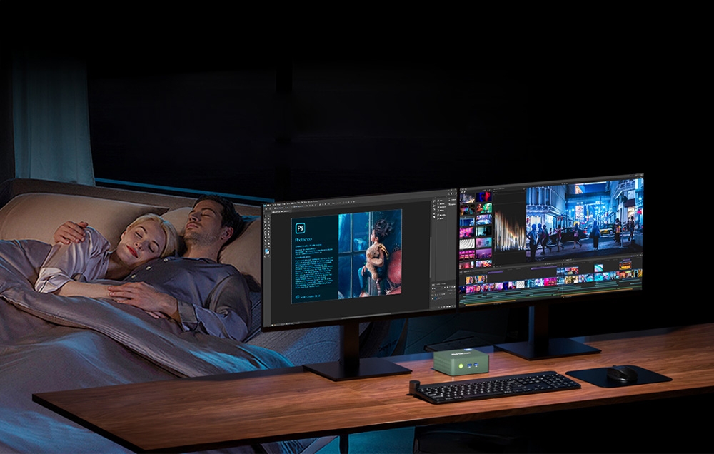 A Mini PC segítségével 2 monitor csatlakoztatható 4K@60Hz felbontásban a HDMI 2.0 csatlakozók révén. Az ilyen konfiguráció kényelmes többfeladatos munkavégzést, jobb alkalmazáskezelést és zökkenőmentes nagyfelbontású tartalmak lejátszását teszi lehetővé. Ez jó megoldás mind üzleti felhasználók, mind otthoni használat esetén.