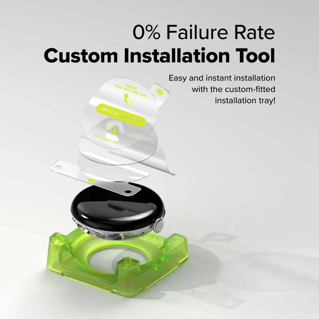 A Ringke Dual Easy Pro Film csomag két darab kijelzővédő fóliát tartalmaz, így azonnal kéznél lesz egy tartalék, ha szükségessé válna. A mellékelt telepítő tálcának köszönhetően a csere gyors és egyszerű, biztosítva az óra folyamatos védelmét a mindennapok során.